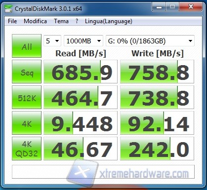 Nella modalità High Performance with Cache Protection il drive mantiene un ottimo rendimento in lettura attestandosi circa sui 720 MB/s nel sequenziale. Perde invece terreno sul lato scrittura dimezzando con un drastico calo delle prestazioni. Ovviamente tale modalità è rivolta all'integrità dei file più che alla velocità di trasferimento ed è evidente quindi come i dati vengano scritti direttamente sull'HDD, senza sfruttrar ela cache. Notiamo infatti come nei 4K QD32 il valore in scrittura si attesta ad un solo megabyte e mezzo a confronto dei 242 MB/s della modalità "Prestazioni Massime". Ciò è dovuta alla lentezza dei dischi meccanici con file 4K.